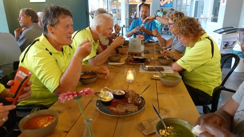 Precies om 12.30 uur komen we aan bij de Oude Keuken op het GGZ terrein. De twee gereserveerde tafels voor 20 personen staan al klaar en we kunnen kiezen: groentesoep of paprika-venkelsoep met toast en diverse smeersel voor op de toast.